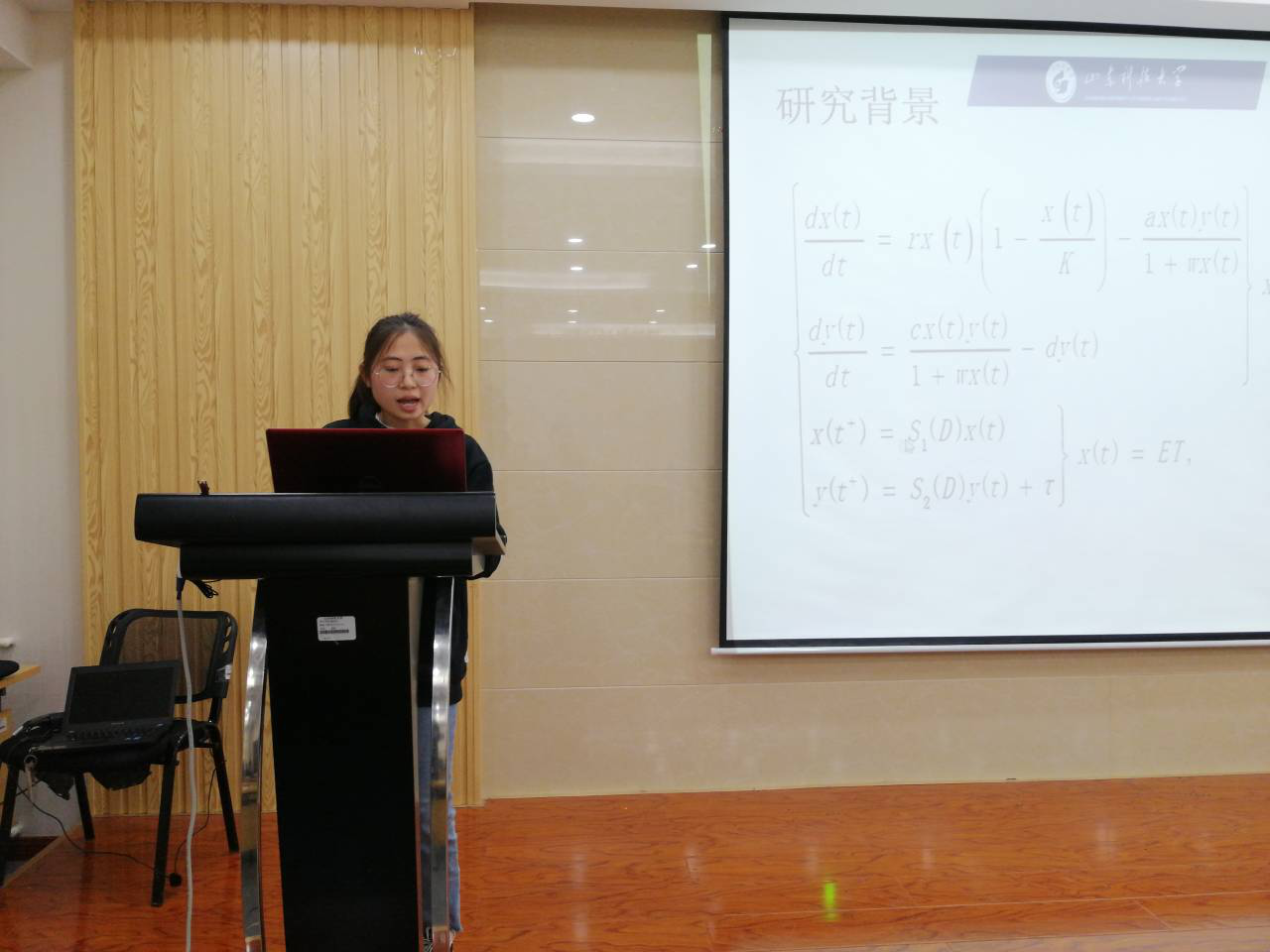2019级应用数学硕士候晓雨作了题为“具有农药剂量作用和状态反馈控制的Holling II捕食-食饵模型”的报告。本次讲坛邀请的点评嘉宾是新濠博亚娱乐