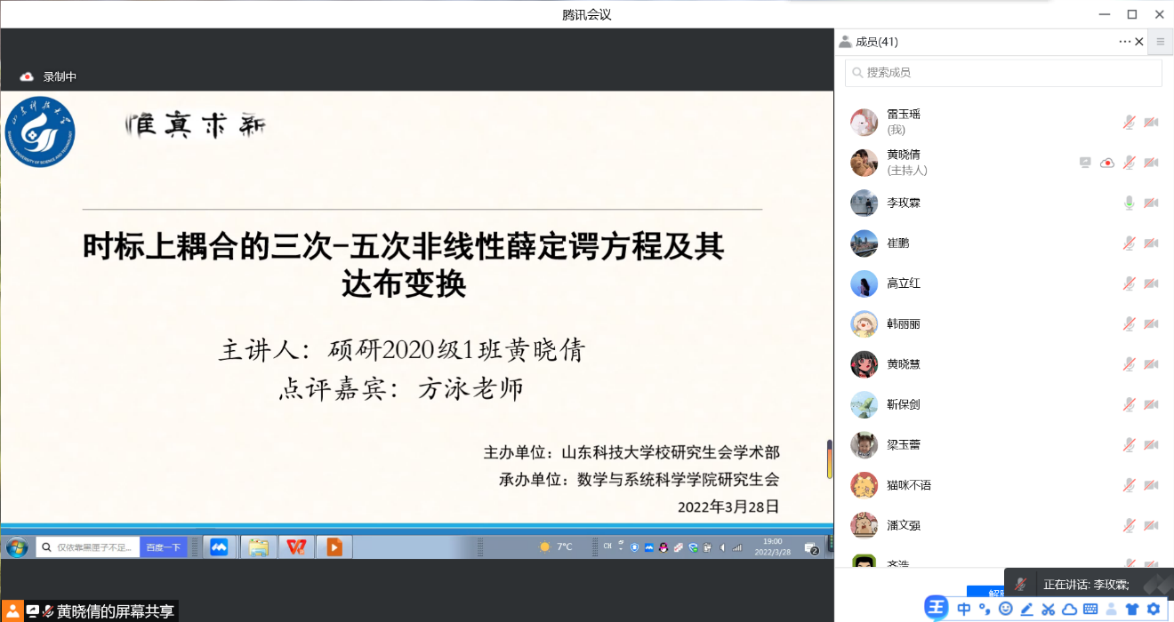 2020级数学专业硕士黄晓倩作了题为“时标上耦合的三次—五次非线性薛定谔方程及其达布变换”的报告。本次点评嘉宾是新濠博亚娱乐