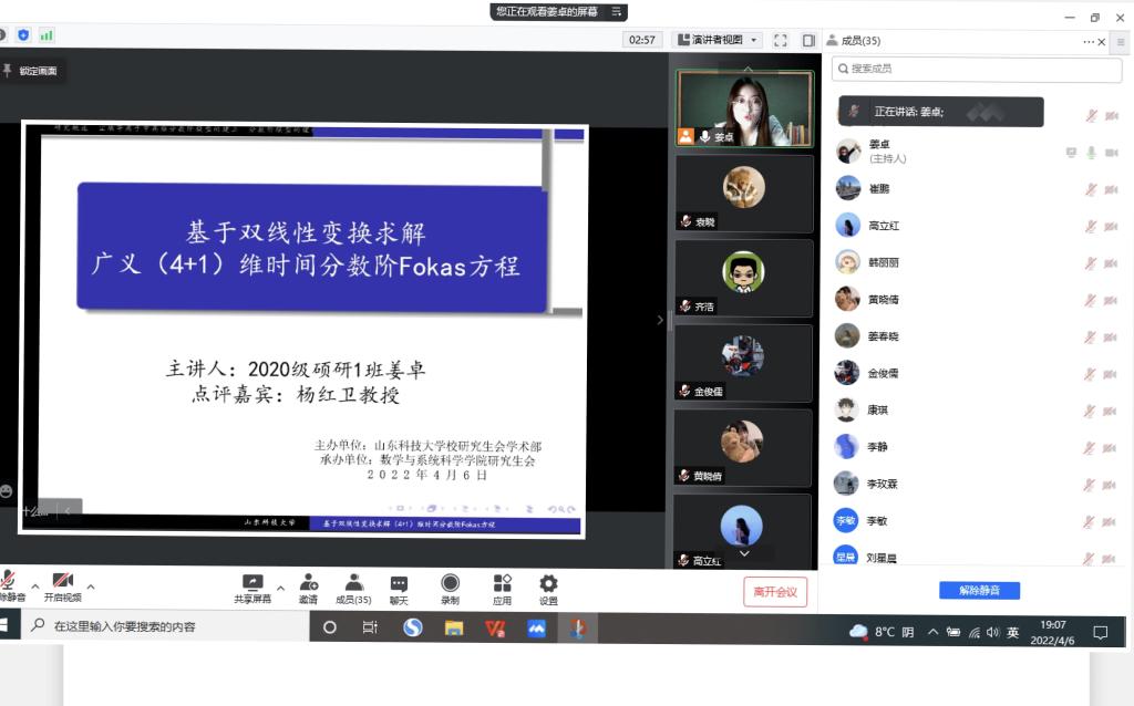 硕研2020级1班姜卓作了题为“基于双线性方法求解广义(4+1)维时间分数阶Fokas方程”的报告。本次点评嘉宾是新濠博亚娱乐