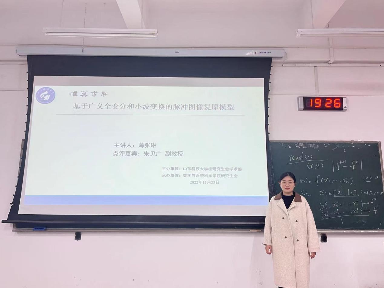 2021级硕士薄张琳作了题为“基于广义全变分和小波变换的脉冲图像复原模型”的报告。本次讲坛的点评嘉宾是新濠博亚娱乐