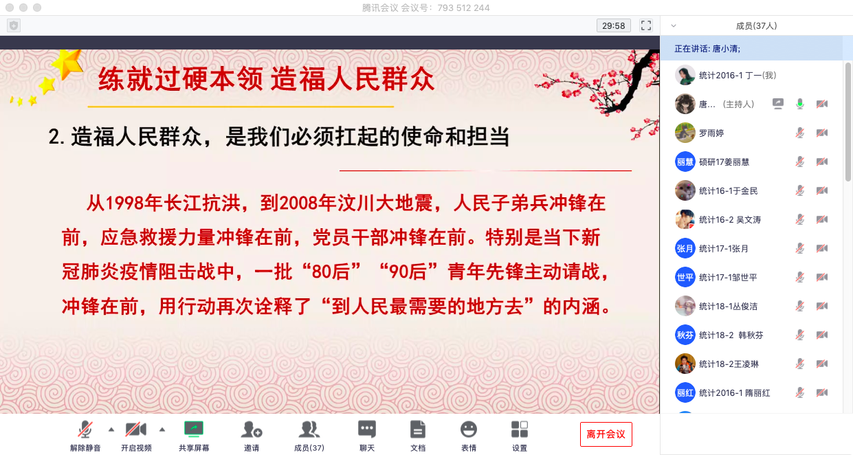 3月13日上午,第四期“青春党建线上微讲堂”在线上会议室举行。本期微讲堂由学生第一党支部党员唐小清和吴文涛担任主讲,学生第一党支部党员及入党积极分子参加。