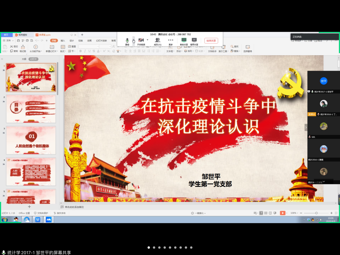 4月9日上午,第十三期“青春党建线上微讲堂”在腾讯会议室举行。本期微讲堂由学生第一党支部预备党员邹世平担任主讲,学生第一党支部党员、预备党员及入党积极分子参加。