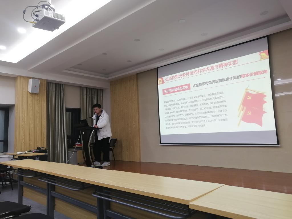 楚国祥以“铁血军魂 扬我国威”为主题,从我军的光荣传统、弘扬我军光荣传统的科学内涵与精神实质、弘扬我军光荣传统的重要性、如何弘扬我军的光荣传统、永葆革命军人不变本色五个方面进行了讲述,并指出只有继承和弘扬我军光荣传统和优良作风,才能确保党对军队的绝对领导,才能保证在各种复杂斗争中经受住严峻考验。