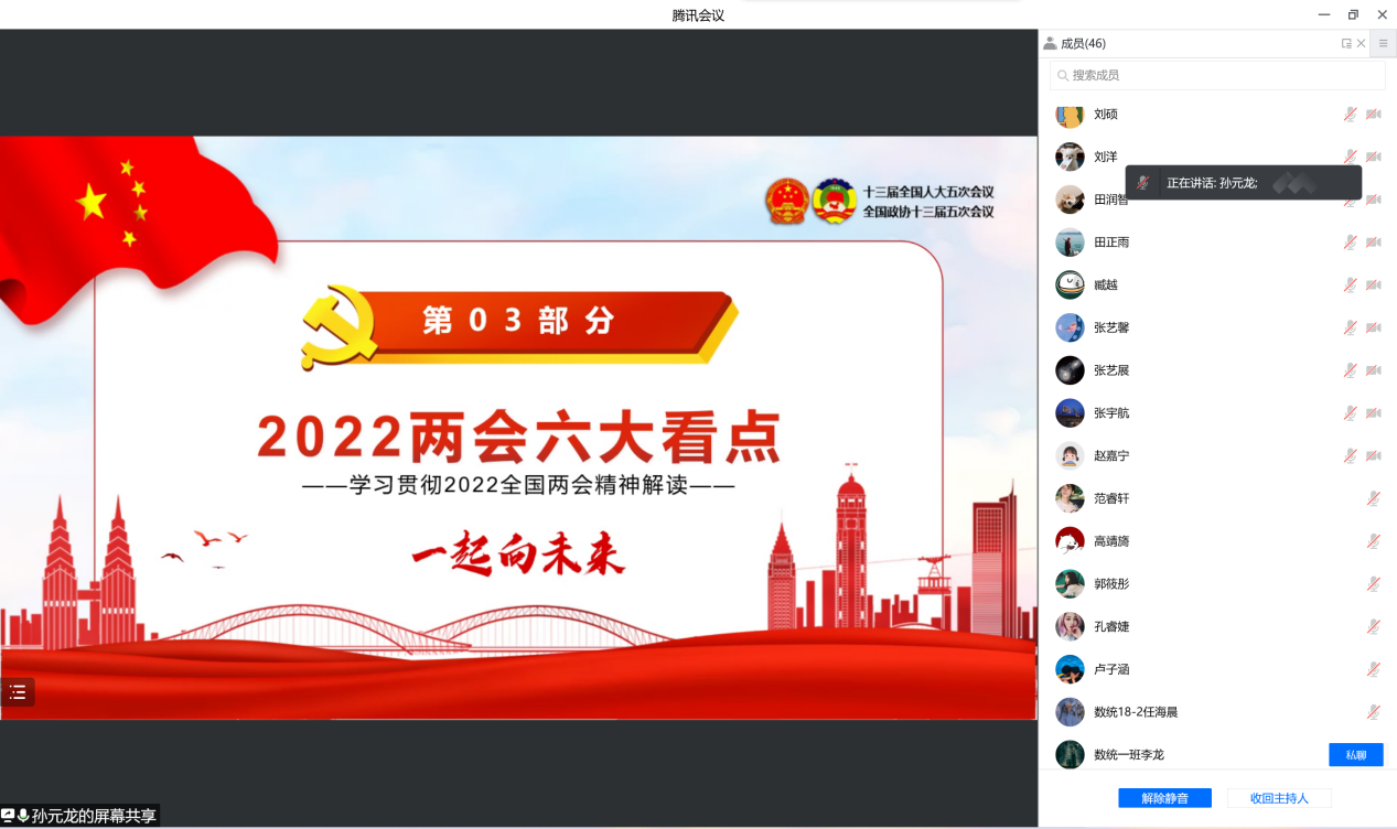 孙元龙和胡若凡带领大家共同学习了“两会”的基本概念,学习了2022年全国两会的总体情况、丰富内涵和核心要义。他们指出,作为新时代的青年党员,要把深入学习贯彻两会精神作为当前和今后一个时期的一项重要政治任务,不断加强自身建设,实干务实,知行合一,以两会精神为指引,努力展现新作为新气象。