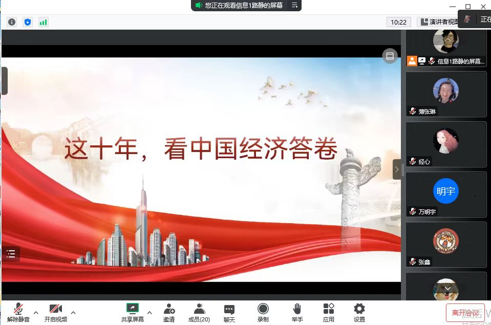 10月15日晚,新濠博亚娱乐 学霸助教团师生党支部通过腾讯会议线上举办了 “青春党建微讲堂”主题教育活动。本次微讲堂由学霸助教团师生党支部党员路静担任主讲,主题为“中国这十年”。学霸助教团党支部全体成员参加了此次会议。