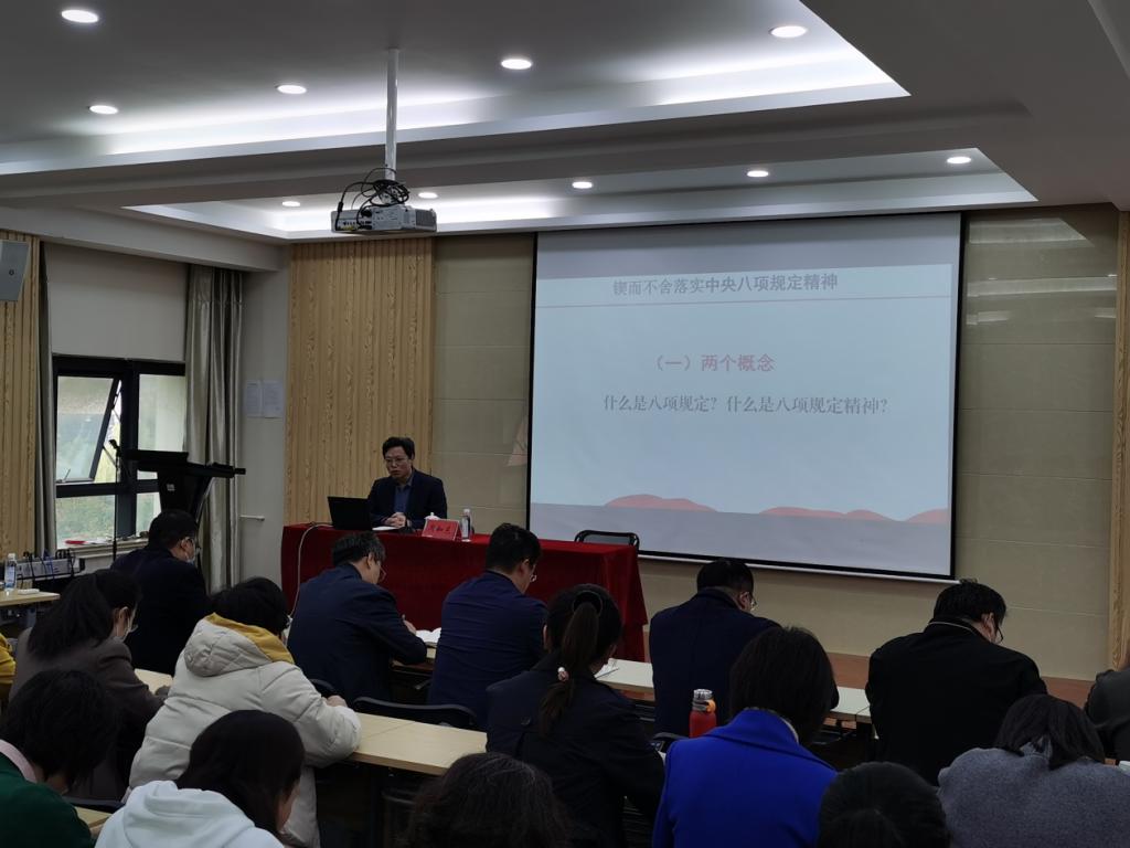 周如东以“锲而不舍落实中央八项规定精神”为题,从理清中央八项规定与中央八项规定精神两个概念入手,围绕中央八项规定产生的背景、具体内容、禁止清单以及执行成效等方面,结合发生在高校违反中央八项规定精神的事例,结合工作实际,深入浅出地对中央八项规定精神进行了详细阐述。对大家关注的公务出行、公务接待、礼品往来以及婚丧喜庆等如何落实好中央八项规定精神进行了详细解读。