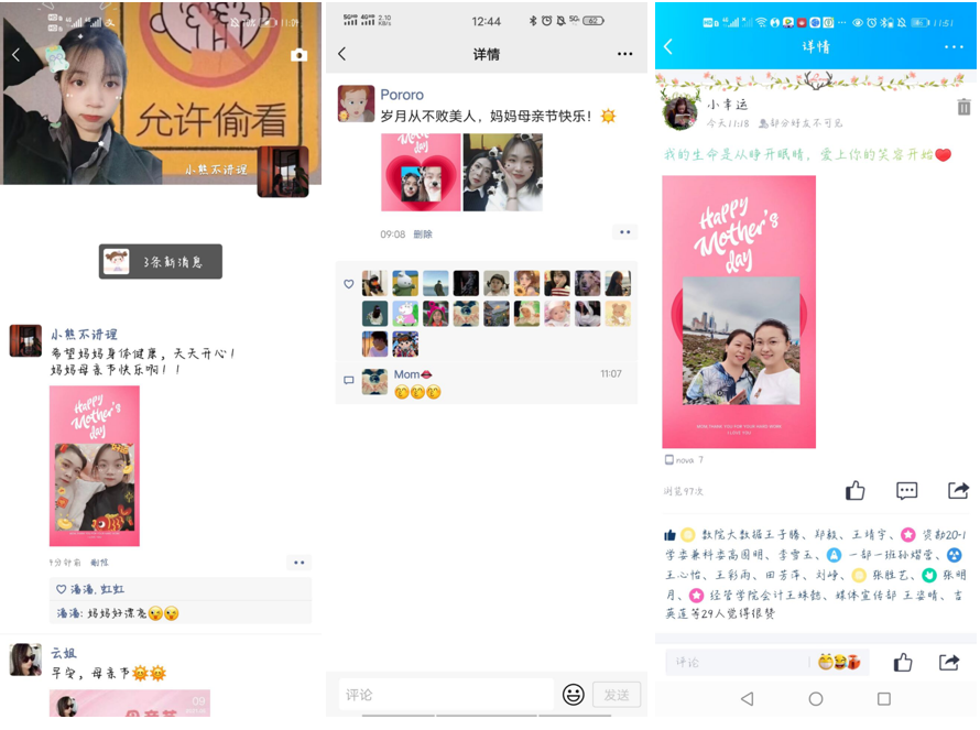 活动分为“线上晒合影”和“线下送情书”两部分,在线上活动中,同学们在朋友圈或QQ空间幸福地晒出了自己母亲或与母亲的合照。“与母亲共过我的18岁生日”“妈妈生日时,送给妈妈的鲜花”...一张张照片的背后,记录着和母亲一起度过的美好时光。线下活动中,同学们纷纷在展板便利贴上书写向母亲表达感谢的话,或以感恩书信的形式将“爱”寄回家,把朴素的言语化为温馨的感动,用美好的祝福传递自己的反哺之情。