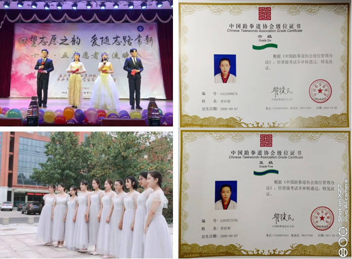 封奕宇热爱舞蹈,积极参加各种舞蹈比赛,用舞蹈去感悟世界,将浪漫汇聚于生活,获校传统舞大赛三等奖等。桑雪与南来馨积极参加主持人大赛,她们互相帮助,在实践中学他人之长,补己之短,桑雪更是加入院主持队,凭借她标准的发音,临场发挥与随机应变的能力主持多次大型晚会,把播音主持当作兴趣和爱好,不断充实、提高自己。何静和冯丽颖曾参加院运动会,在女子1500米中分别荣获第二名与第三名的成绩,她们坚持锻炼,互相激励,用激情和奋斗让青春之花绚丽绽放。曾祥婷在大一加入跆拳道协会,坚持每周训练,“学习跆拳道是一个不断适应,超越自己的过程,每当坚持不下去的时候,只要想着再坚持一下,便会有意想不到的收获”,她在宿舍这样说,经过了三年跆拳道的学习,她成功考取了跆拳道五级证书。