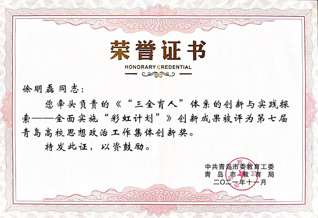 党委书记徐明磊牵头负责的《“三全育人”体系的创新与实践探索——全面实施“彩虹计划”》创新成果获评第七届青岛高校思想政治工作集体创新奖。