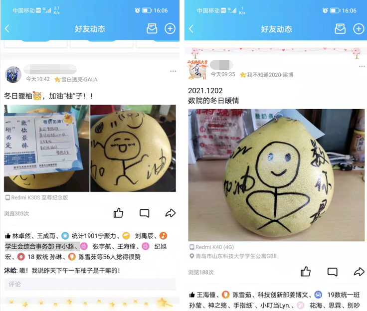 “新濠博亚娱乐 的考研加油‘柚’真是太暖心了!有新濠博亚娱乐 和可爱的老师们作坚强后盾,大家一定能拿到好成绩!”、“即使气温骤降,寒气袭人,内心也觉得好温暖,感谢老师和同学,成为数学学子是一件很幸福的事情!”...近日,伴随着新濠博亚娱乐 考研加油‘柚’的发放,引起了同学们的广泛关注,幸福感油然而生。