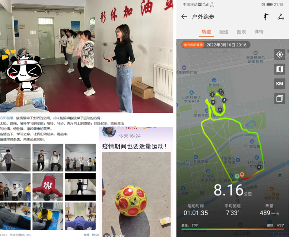 接力打卡,学习、健身共同助力疫情防控。为提高同学们对学习和运动的积极性,展现大学生的时代风采和精神风貌,团员青年纷纷参与“科学防疫我打卡”、“健身运动我参与”打卡系列活动,通过打卡方式及时分享防疫知识学习及跑步、跳绳、篮球等健身运动,在收获点赞的同时,也激发了同学们热爱生活的美好情感。