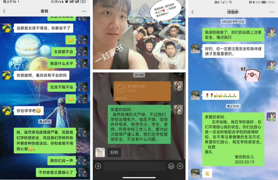 “一封家书”,让远方牵挂亲人安心放心。面对近期复杂严峻的疫情防控形势,为给远方牵挂的父母亲人报个平安,各团支部积极组织团员通过微信留言、发布朋友圈等新颖形式“家书”向家人报个平安,并通过个人或宿舍集体拍摄校园生活照片、录制校园生活短视频等形式,记录校园生活点滴,与家人朋友分享这段特别的校园生活。