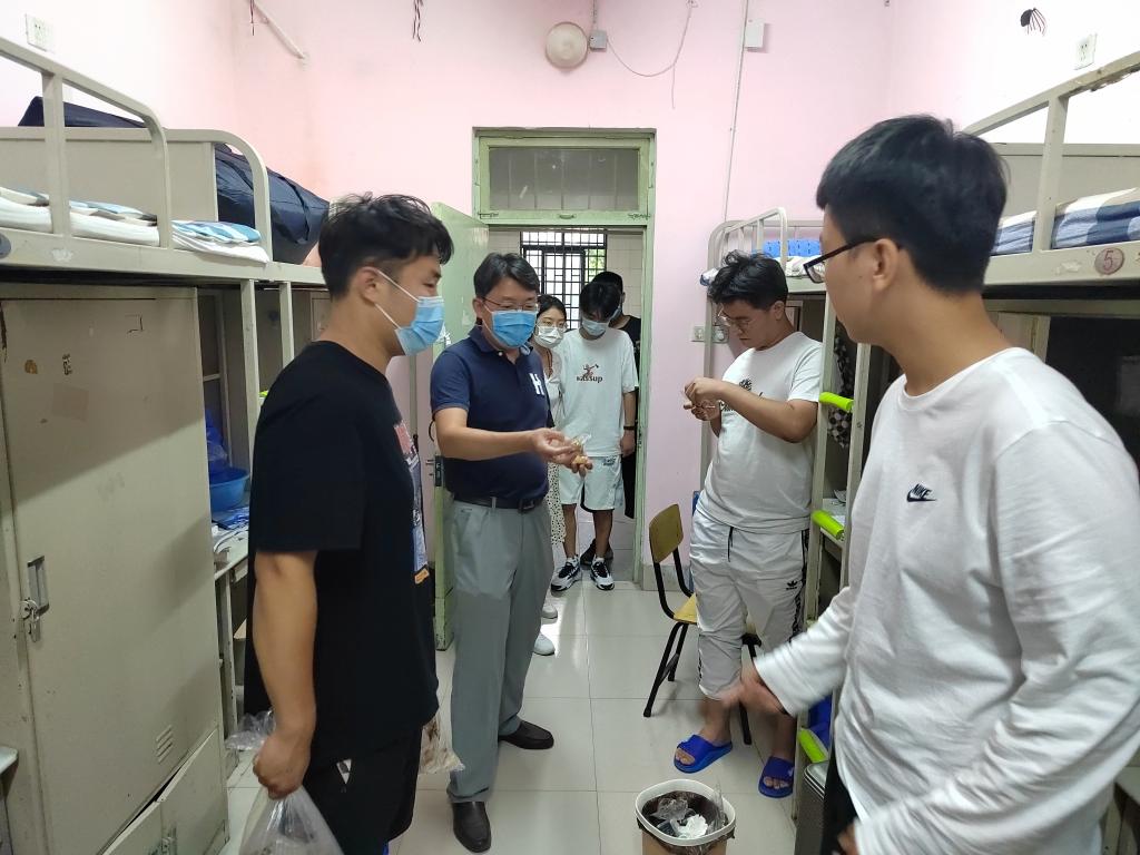 刘辉一行走进各年级宿舍楼,与同学们亲切交谈,仔细询问了他们的学习、生活等状况,同时强调了疫情防控要求,希望同学们理解、支持、配合学校的疫情防控措施,自觉遵守纪律,保持学习热情,展现大学生的自律担当。在轻松愉快的交流中,老师们逐一为同学们发放了新濠博亚娱乐 精心制作的爱心月饼。