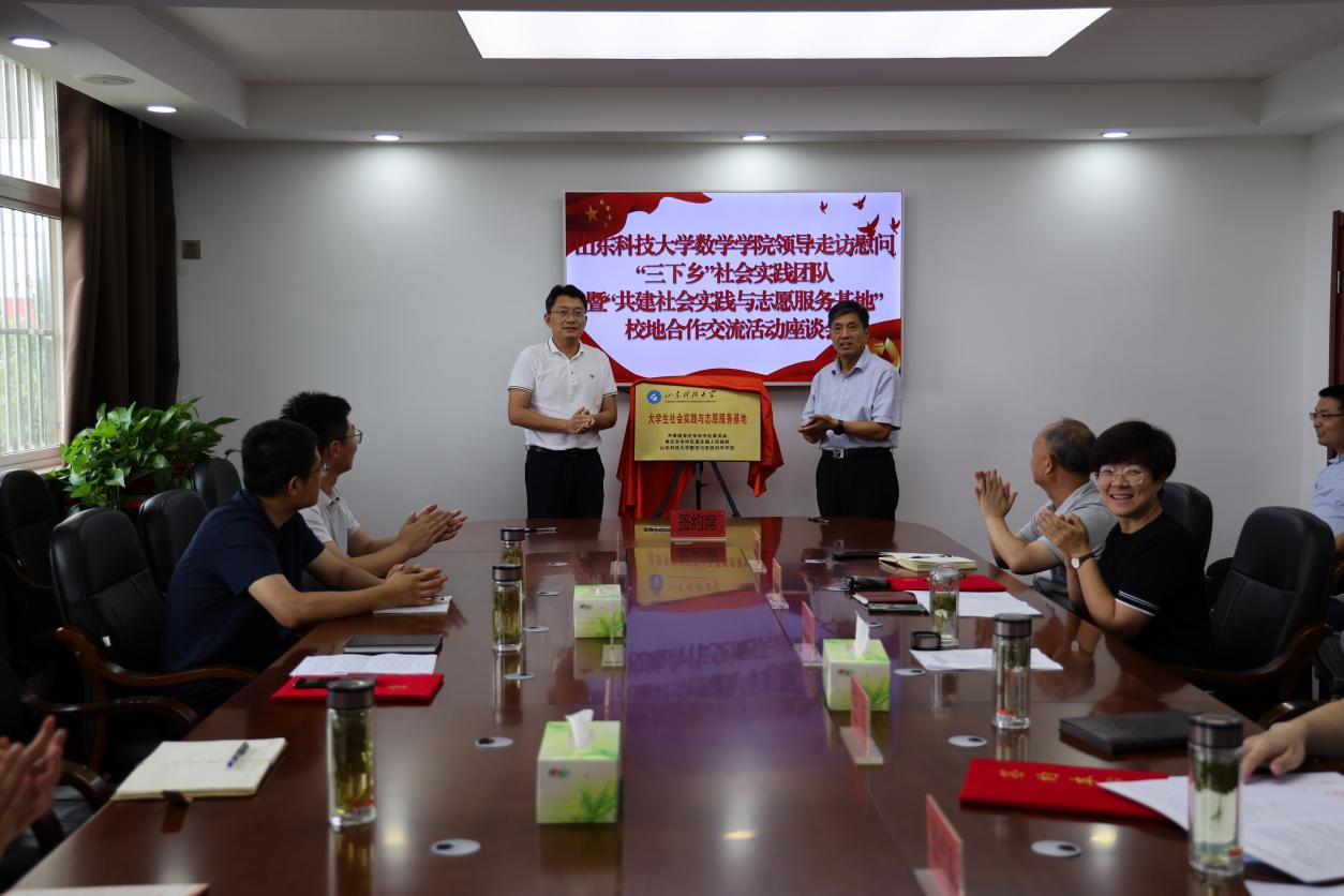 为深化校地合作,引导和激励广大青年大学生深入基层、积极投身社会实践。7月23号,新濠博亚娱乐 党委副书记刘辉等一行4人前往枣庄市市中区孟庄镇走访慰问蜜枣志愿服务队并参加“共建社会实践与志愿服务基地”校地合作交流活动座谈会,区人大常委会副主任孙永海、团区委书记王尧、孟庄镇党委副书记、镇长宋晓娜出席活动。会上,新濠博亚娱乐 与枣庄市市中区委员会、孟庄镇人民政府签订了《山东科技大学数学与系统科学新濠博亚娱乐 大学生社会实践与志愿服务基地共建协议书》,并共同为大学生社会实践与志愿服务基地揭牌。