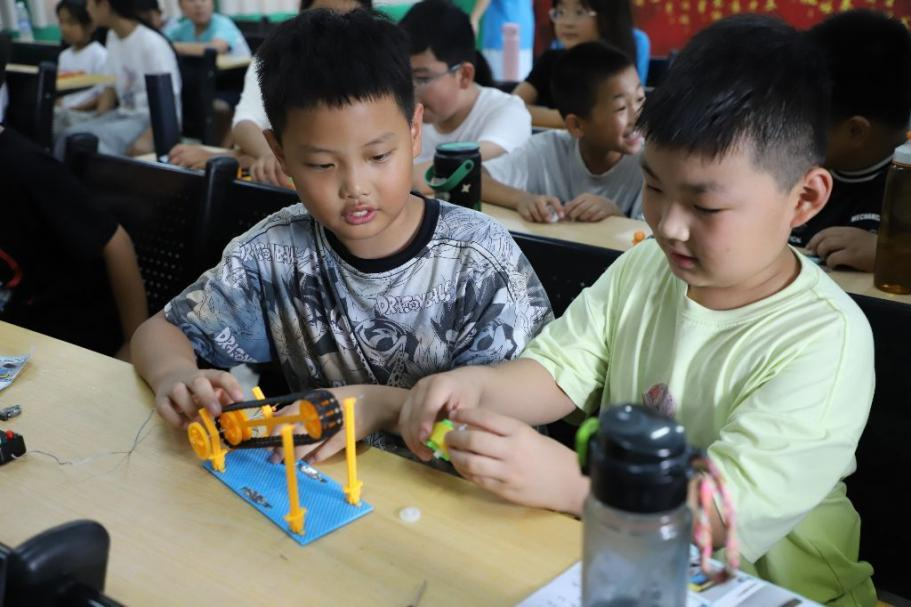 科技启蒙课上,通过“扶梯传送小制作” 让孩子们动手拼搭传送带、升降台模型,在实践中探索机械原理。安全教育课堂上,志愿者们通过通过 PPT 讲解和 “清水变饮料” 实验,教会孩子们识别添加剂、辨别过期食品;通过角色扮演教会孩子们用电安全与应对雷暴天气;通过情景模拟和 “交通大富翁” 游戏,教会孩子们牢记 “一停二看三通过”;运动安全宣讲则从服饰穿戴、拉伸方法等细节入手,筑牢健康防线。