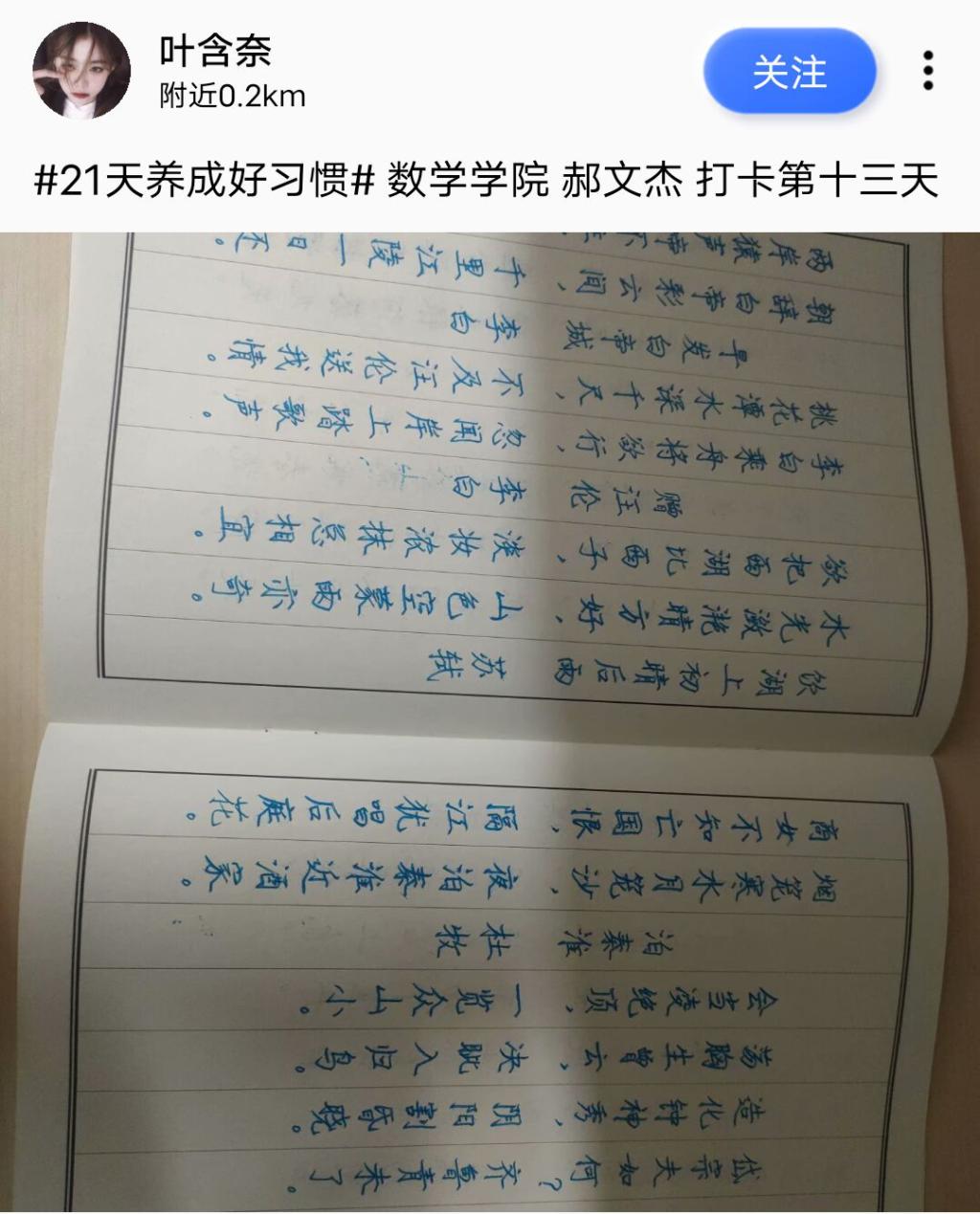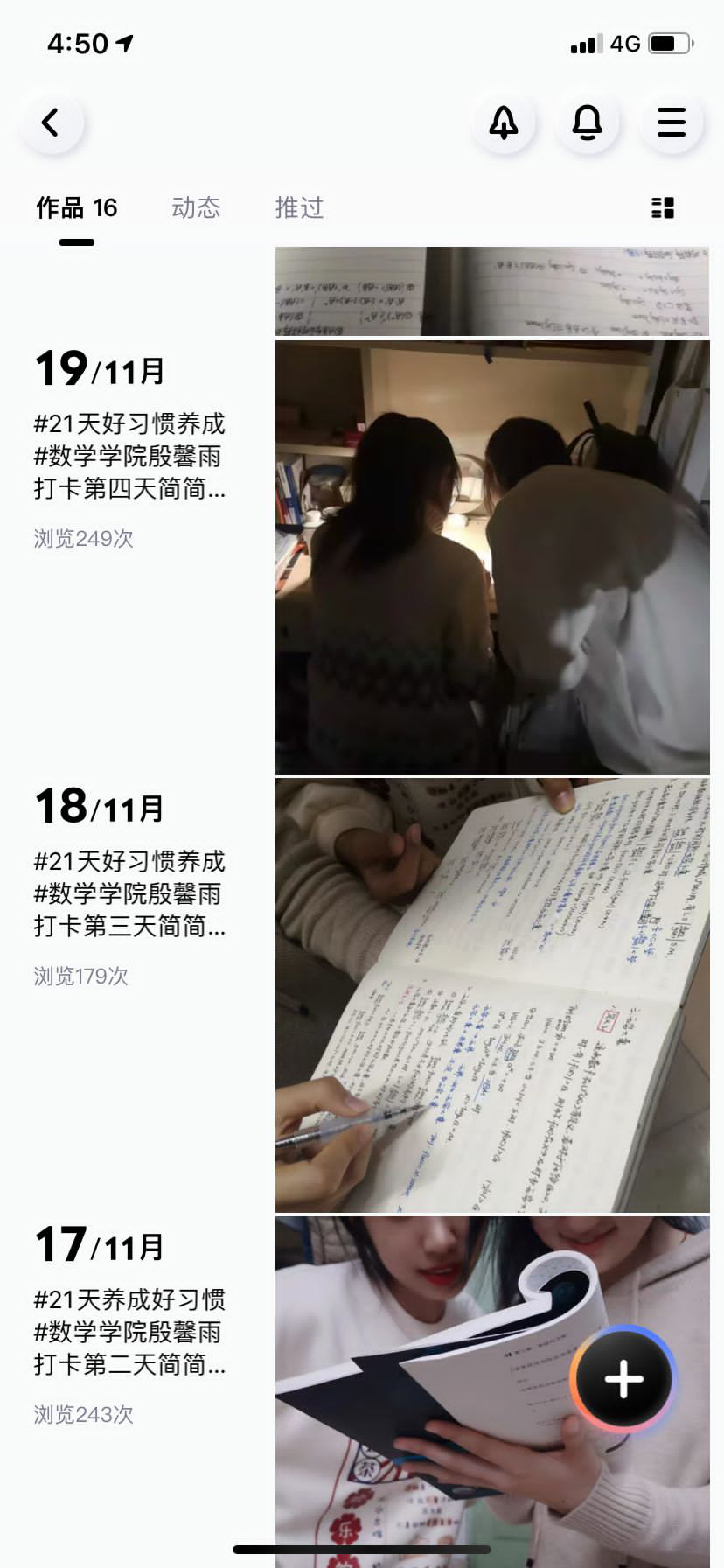 活动分为四个部分:宿舍卫生——保持住宿环境干净整洁;个人学识——每天记录一道错题或好题,每天记单词或看书半小时;品德修养——坚持运动健身或培养兴趣爱好;热心助人:每天教同学一个知识点,或帮助同学解答一个难题。参与活动的同学采用线上打卡模式,并将截图发送给活动工作人员。本次活动参与同学共计107人,绝大部分同学圆满完成活动任务。