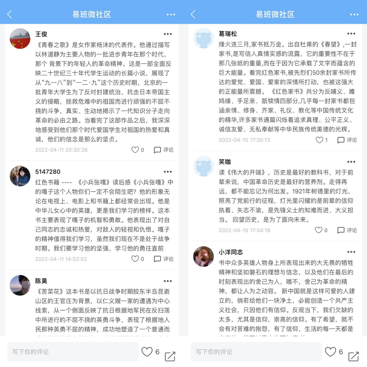 活动期间,同学们积极报名,广泛参与,展现出了强烈的阅读意愿,“三红一创、青山保林”等红色经典滋润着同学们的心灵,激发着同学们的爱国热情。在易班APP里,同学们纷纷分享自己的读后感,“终其一生追求高尚理想的人,必将是伟大的;那些躲在阴暗角落中的蝼蚁,永远无法体会‘生的伟大,死的光荣’的意义。”