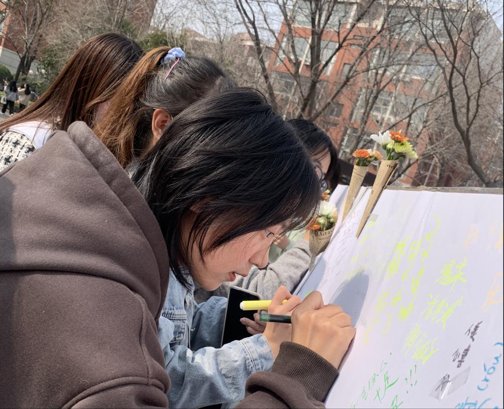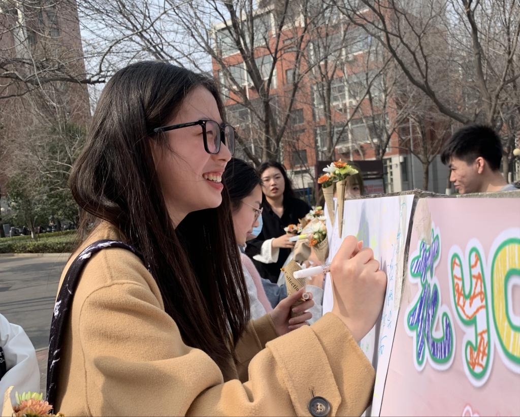 “一束鲜花献真情,一张贺卡表祝福”,同学们贴心地为工作中的老师们准备了漂亮的鲜花,给女教师们带来了春天的气息和节日的祝福。繁星广场,花香四溢,女性同学在工作人员的引导下留下对节日和未来的美好祝福,并现场领取了定制的精美鲜花。