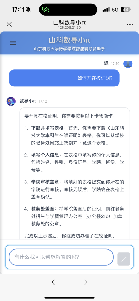 数据科学与大数据技术2024级学生王晓菲,近期需要开具在读证明,通过“数导小π”她第一时间获悉了开具在读证明的全流程。 “‘数导小π’真是太方便了,以后再遇到日常不知道的事儿我一定要先问问它,我也是山科百事通了!”王晓菲欣喜地说。