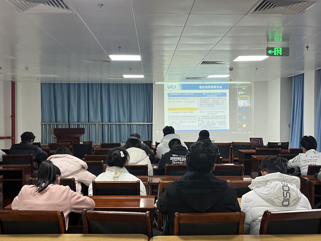 12月2日晚,新濠博亚娱乐 组织有出国留学意向的学生在工程实训大楼1603会议室集中观看了加州大学欧文分校的留学项目线上直播推介会。