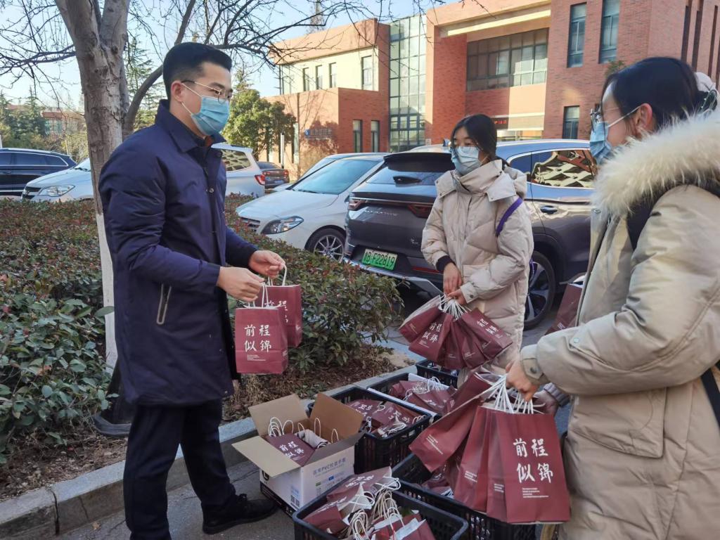 自习室和公寓楼下,师生代表们向备考学子一一送上了充满温暖的“考研加油包”,鼓励考生要坚定信心,持之以恒,同时也希望他们要劳逸结合,科学备考,保持良好心态,以最佳状态轻松应考。礼包中的柿子、橙子、口罩、维C及老师们亲手书写的贺卡寓意着心想“柿”“橙”、“研”途平安!