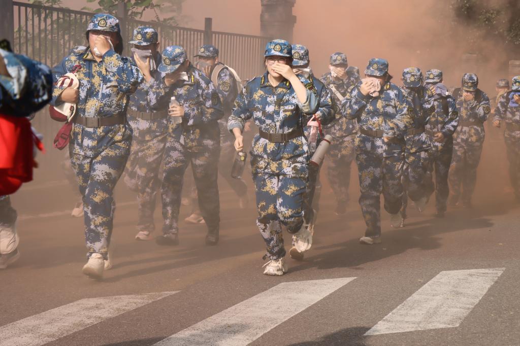 队伍从操场西门出发,沿着既定路线行进。一路上,秋日的阳光洒在身上,既带来温暖,也增添了几分燥热,他们迈着整齐的步伐,歌声、口号声此起彼伏,展现出青春的活力与激情。拉练途中,还设置了多个障碍点,匍匐前进、穿越染毒地带.....他们并肩作战,相互扶持,用行动诠释了团队的力量。经过近三个小时的行进,队伍顺利返回科创园区田径场。此同学们虽然满脸疲惫,但眼神中却闪烁着胜利的喜悦和自豪。