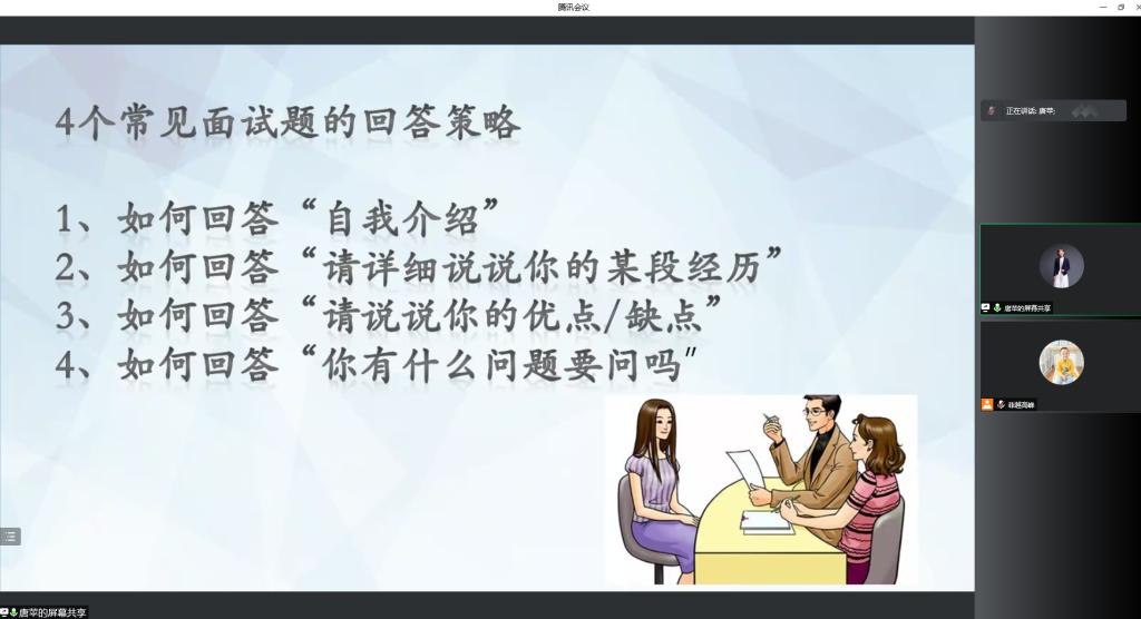 唐苹从三个“就业难”的典型案例谈起,结合自身多年的职业生涯规划经历,围绕“职业早规划 人生不设限”主题,从“就业思维不要靠等”、“职业规划的重要意义”及“求职面试技巧”三个方面进行了详细讲解。她指出,目标是规划的基础,一个清晰、明确、具体的目标能够为踏入社会提供重要的指导,从而让我们更好地立足当下,规划未来,她鼓励同学们摒弃“慢等靠”思维,尽早做好定位,拓宽就业途径,提升求职经验,在找到理想工作的旅程中,不断探索前进。同时,唐苹就求职过程中的简历撰写、面试技巧等向同学们进行了讲解。