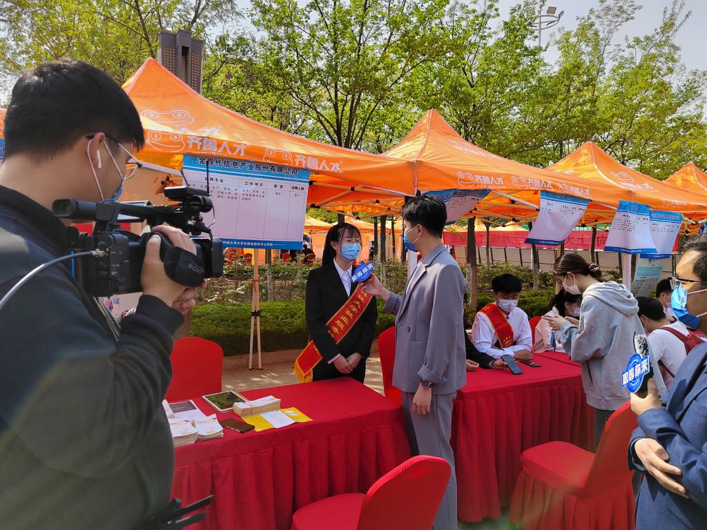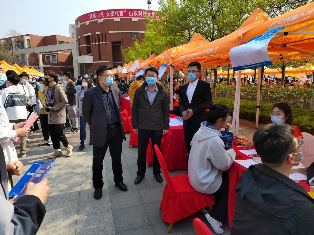 4月20日,山东科技大学春季校园双选会在尤洛卡广场举行。新濠博亚娱乐 党委书记徐明磊、党委副书记兼副院长刘辉、团委书记谢菲菲及各年级辅导员到现场交流参观。