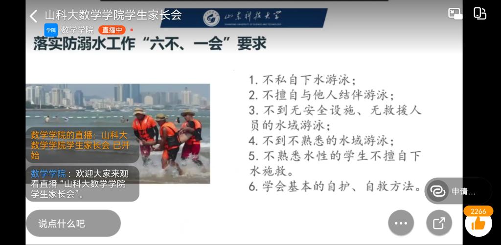 辅导员围绕国内外疫情形势、学校疫情防控要求,大学生防溺水安全知识,电信诈骗的常见手段及预防措施,学生公寓违禁物品管理规定,大学生文明素质养成与行为规范,大学生心理健康的现状及重要性,考研、考博、考公及就业等方面与家长们进行了交流与沟通,同时,结合大学生常见的安全事故典型案例,强调了生命安全和身心健康对大学生全面成长成才的重要意义。