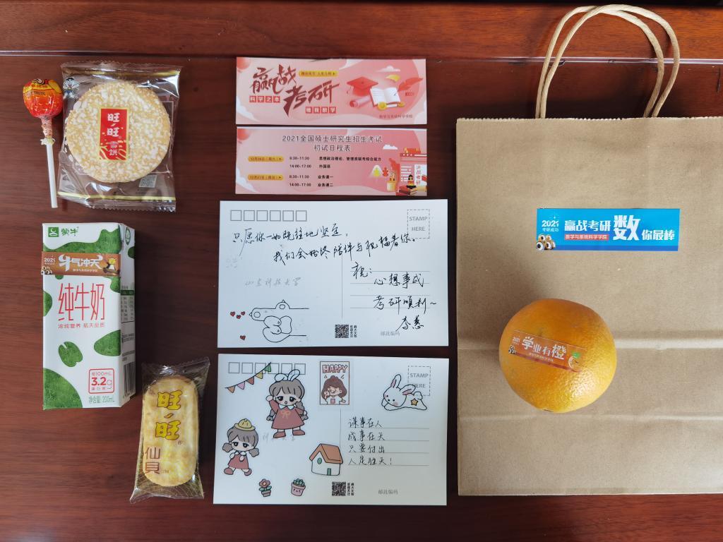 自习室里,辅导员们向备考学生一一送上了充满温暖的“考研大礼包”,鼓励考生要增强信心,持之以恒,顶得住压力,树立必胜的决心,同时也希望他们要学会调整心态,劳逸结合,保持乐观,不给自己过度施加压力。大礼包中的旺旺雪饼、橙子、仙贝、棒棒糖、牛奶及考研时间提示卡,寓意着“旺”你 :“雪”业有“橙”、考试“贝”“棒”、“牛”气冲天!