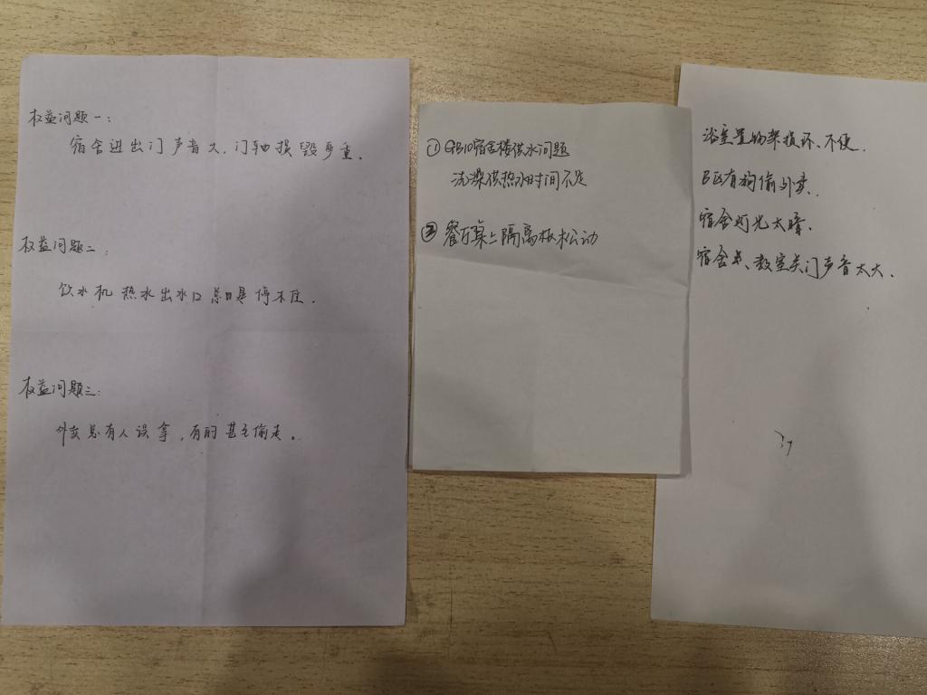 活动现场,同学们积极发言,提出了许多与大学生自身相关的权益问题,如宿舍门轴损坏严重、浴室置物架、饮水机出水口总是停不住、洗澡供热不足、宿舍关门声音过大打扰其他同学休息、外卖总是有人误拿等。随后同学们互相交流了宝贵的经验,并一起探讨了解决方法和措施。针对同学们提出的问题,我院相关负责人员认真收集总结,并积极采取相应措施维护同学们的权益。