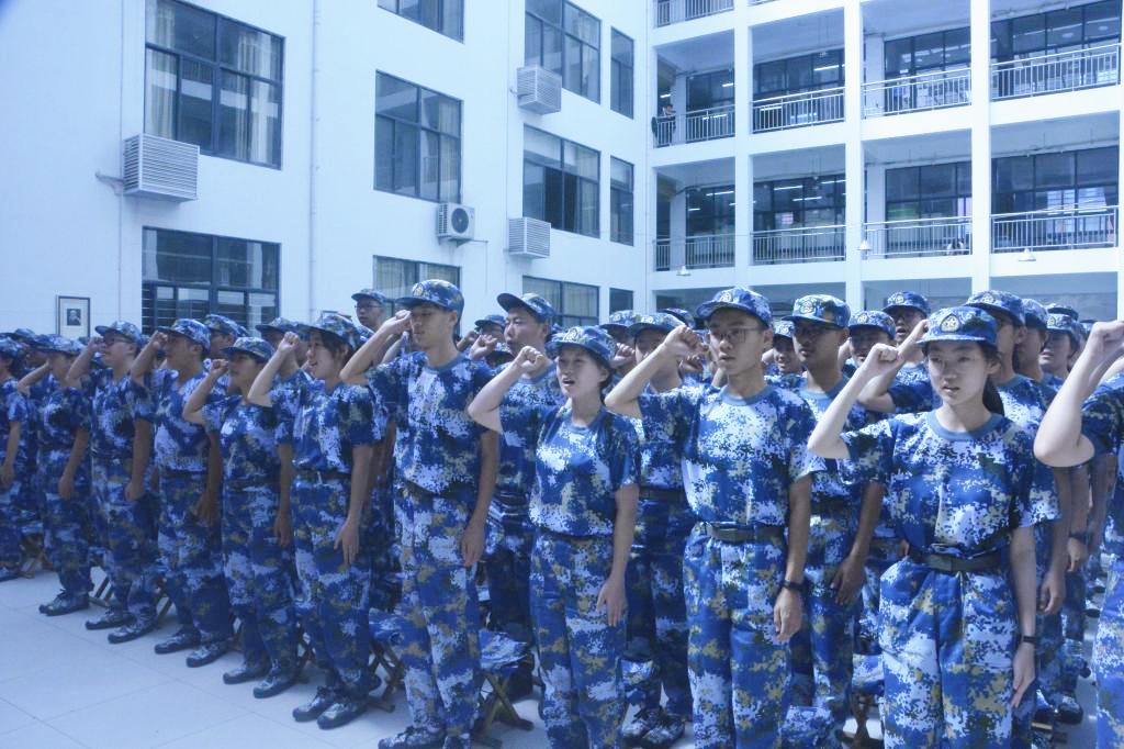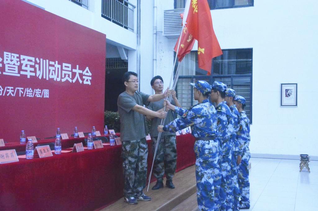 党委副书记兼副院长、军训团教导员刘辉进行军训动员讲话,并为四个军训连队授旗,全体参训学生进行宣誓。
