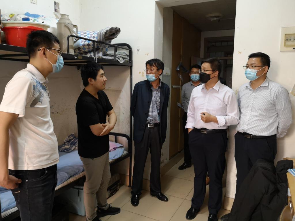 党委书记徐明磊、院长董焕河、党委副书记兼副院长刘辉、副院长王震、研究生导师邹玉梅及辅导员来到宿舍看望返校学生,各位领导和老师对返校学子表示欢迎,并详细询问了学生的返校后安排、毕业设计进度及就业等情况,叮嘱学生要珍惜时光,刻苦学习,增强防疫意识,做到防疫与学习“两不误”,辅导员也在宿舍现场给学生发放了宿舍消毒记录本和防疫学习手册。
