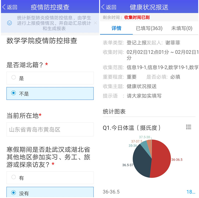 建立了防疫数据报送和学生每日健康状况报送机制,自1月31日起,坚持利用爱班级危机应急模块的疫情防控摸查和健康状况报送进行数据的采集、分析与筛选,实现一人一档案并可随时查看学生上报情况,收集完成后自动生成的分析图表也更有利于有针对性地开展学生疫情防控工作,对新濠博亚娱乐