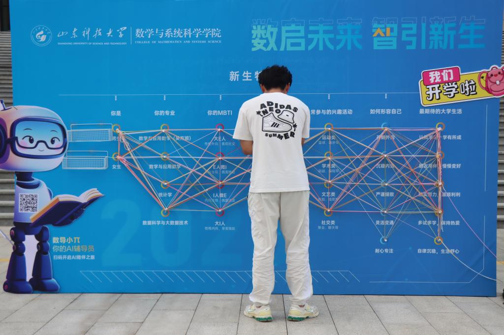将专业特色融入迎新细节,“数导小π”AI智能辅导员亮相迎新现场,通过线上平台为新生提供入学流程、公寓设备使用、军训注意事项等一站式咨询服务。同时,现场设置“彩丝缠线-新生特写”互动游戏,通过“缠线”问答的方式,精准获取新生性格画像,帮助新濠博亚娱乐