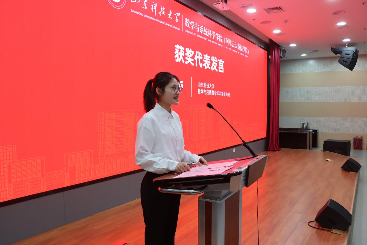 数学与应用数学2023级吴方班学生于炎丽作为获奖代表发言,她分享了班级“勤学乐思、和谐互助”的学风建设经验,回顾了全班同学在课程学习中互帮互助、在科创竞赛中携手攻坚的成长历程,表示将珍惜荣誉、再接再厉,带动更多同学深耕专业、勇攀高峰。