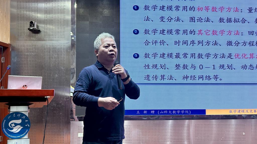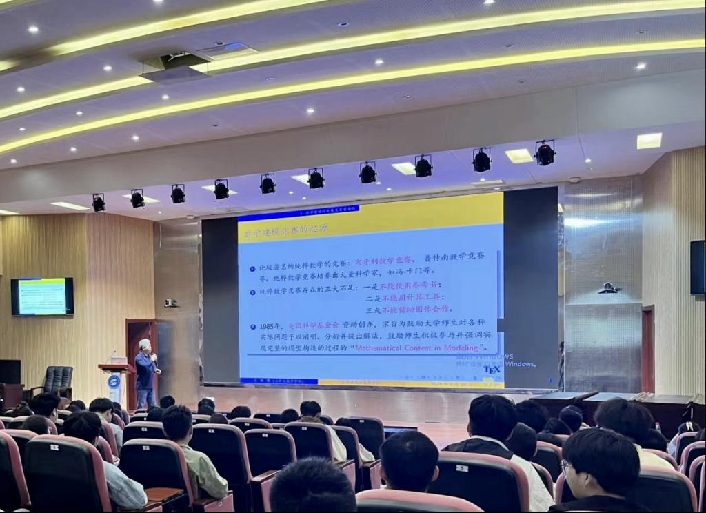 王新赠副教授应邀在J9-144报告厅为参赛学生和指导老师作数学建模竞赛知识讲座。讲座中,王新赠从基础知识讲起,用简单易懂的例子生动形象地解答了什么是数学建模、为什么要建模以及应该怎样建模等问题。王新赠围绕如何备赛、如何培养建模能力等进行重点介绍,他结合全国大学生数学建模竞赛真题,详细讲解了数学建模的方法以及解题步骤。王新赠鼓励同学们以参加数学建模竞赛为契机,以赛促学,为个人全面发展蓄势赋能。