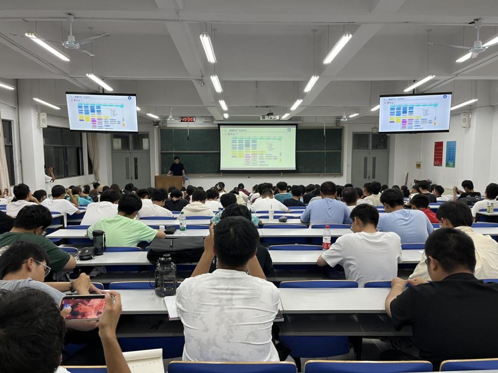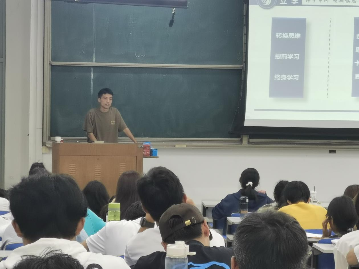 崔冰涛详细介绍了个人情况,从专业学习、学生干部工作、社会实践、科创竞赛、四年发展方向五个方面展开分享,他以“学什么、怎么学、学了有什么用”三个问题为切入点,依托自身优秀的学习成绩,向新生们分享了学习经验。他提到要合理规划时间,养成良好的学习习惯。针对班委,他建议在推进学生管理服务工作的同时,也要兼顾自己的学业。