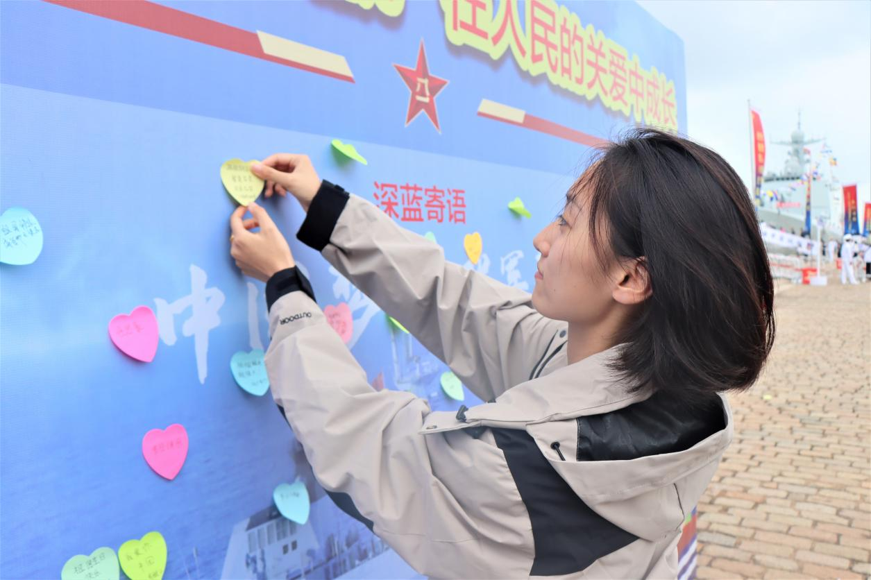 现场,师生有序上艇参观,沉浸式体验海军舰艇的庄重威严与人民海军的精神风貌,了解舰艇的作战性能、武器装备等。最后,同学们纷纷与官兵互动,体验海军特色文化,参与国际信号旗语和穿戴防火服等海军特色科目展示体验,感受海军官兵的风采。