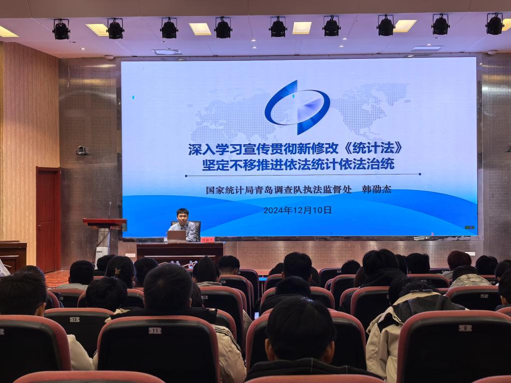 于J9-144报告厅举办普法宣讲活动,邀请国家统计局青岛调查队与国家统计局青岛西海岸新区调查队针对新修改的《中华人民共和国统计法》进行宣讲。