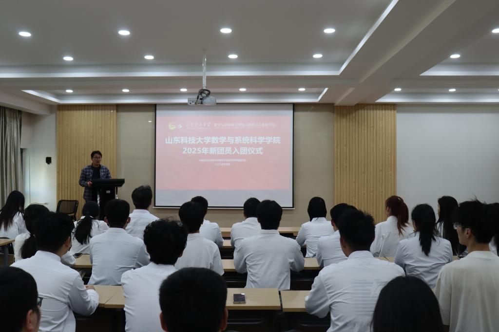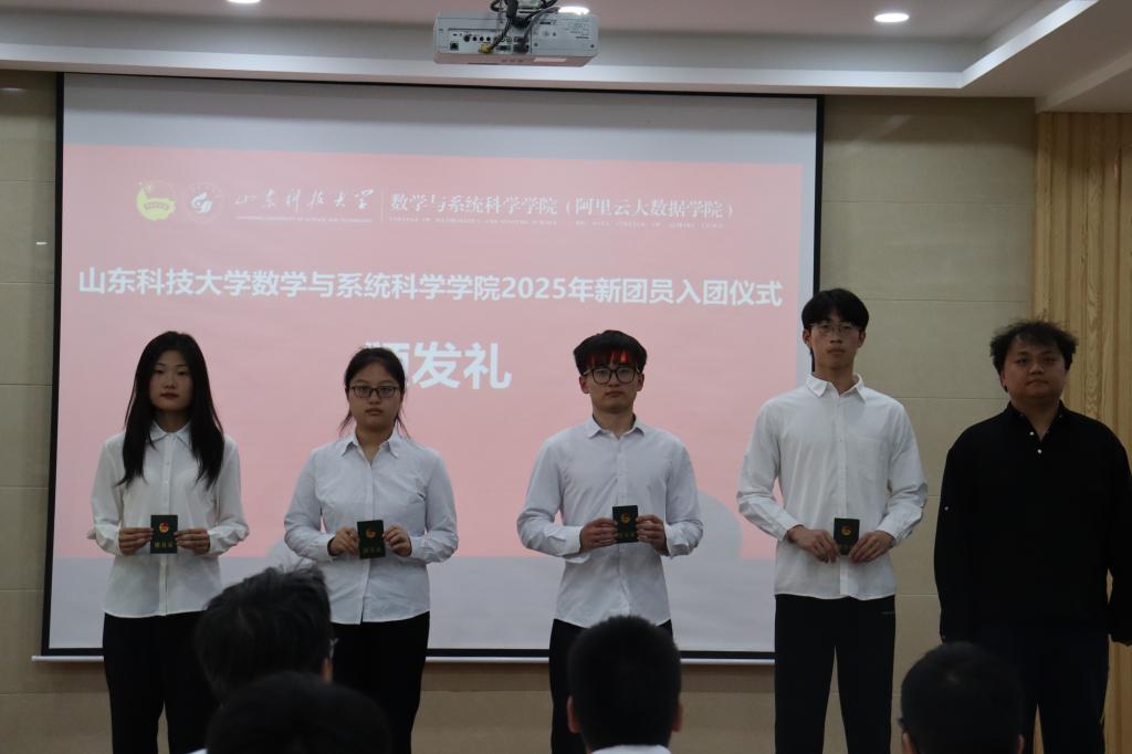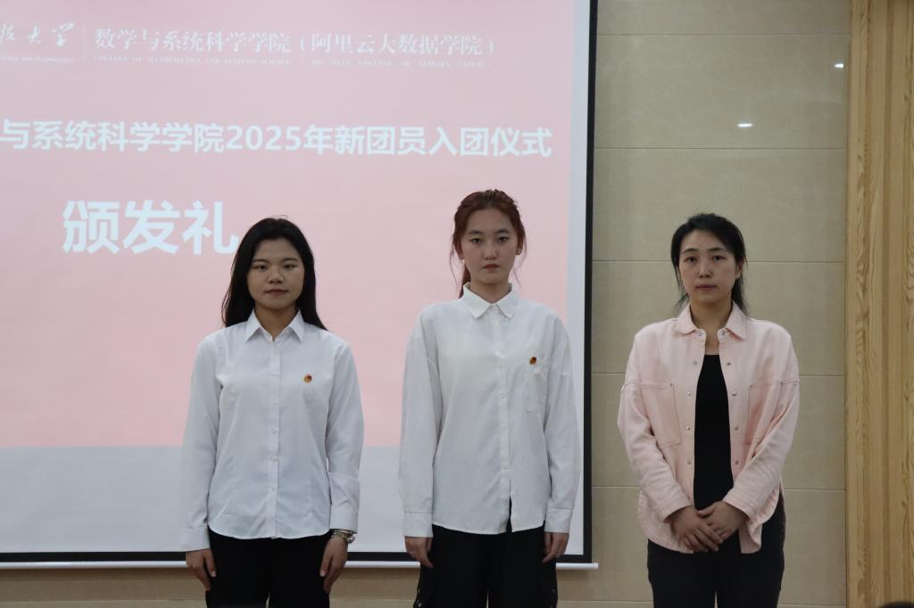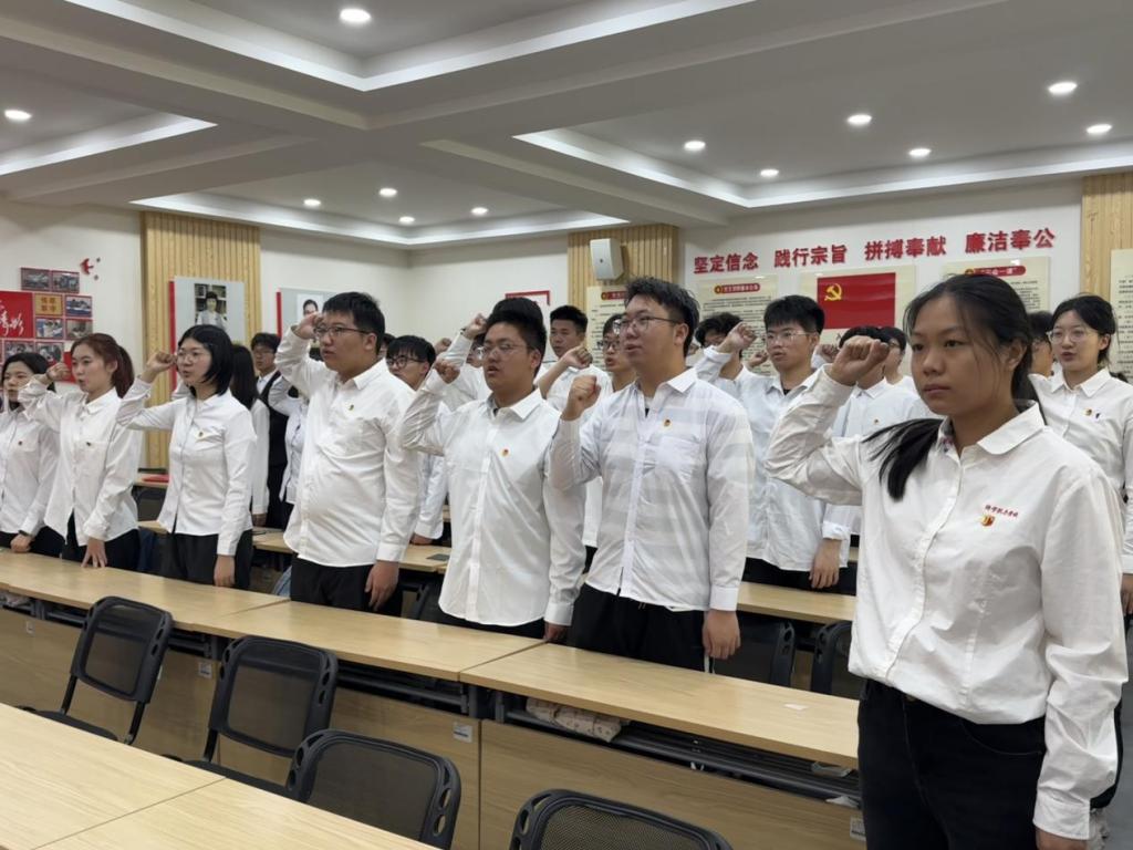 仪式在激昂庄严的国歌声中正式拉开序幕。贾梓霆宣读2025年上半年新团员名单并向新团员致以祝贺。随后葛天晨为新团员颁发团员证,谢菲菲为新团员佩戴团徽。新发展团员刘蕊担任领誓人,带领新团员们面向团旗,举起右拳,进行庄严的集体宣誓。