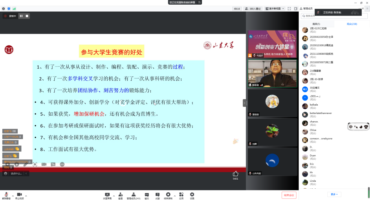 4月29日下午,由创新创业新濠博亚娱乐 、校团委、国家大学科技园、学生工作部(处)主办,新濠博亚娱乐 承办的2022年第2期(总第132期)创新创业大讲堂在线上开展,山东大学创新创业新濠博亚娱乐 院长顾问陈言俊教授受邀担任主讲,新濠博亚娱乐 党委副书记兼副院长刘辉主持会议,400余名师生参与线上讲堂。