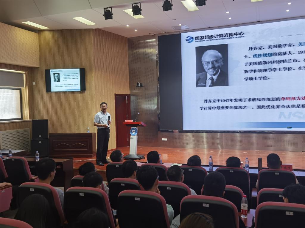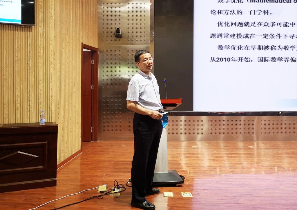 报告中,贺国平以数学优化问题的定义和特点为切入点,为师生们介绍了数学优化问题的发展历程。他强调,随着社会发展,优化理论与方法在国防、经济、管理等诸多重要领域都得到了更加广泛的应用。贺国平结合典型案例,为大家详细剖析和讲解了优化问题的本质,并对优化问题进行了分类总结。他指出,随着大数据时代的到来,数据的产生由手动方式变为自动,而超级计算机的出现,给优化理论研究和算法设计带来了新的挑战。针对目前超级计算下的优化方法的发展,贺国平以独有的学术视角总结了自己近期的研究方向和需要关注的热点问题,面对数字时代背景下的机遇和挑战,他勉励同学们既要有躬耕数学科学研究的热情,又要有抱定“板凳坐得十年冷”的决心,久久为功,才能真正把数学研究搞好,为科技创新提供基础动力。